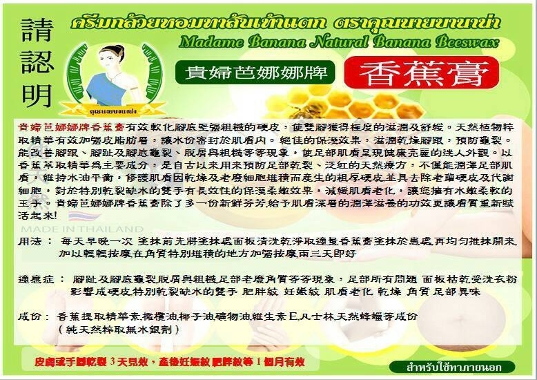 以香蕉萃取精華為主要成分,是自古以來用來預防足部乾裂、泛紅的天然療方,不僅能潤澤足部肌膚,維持水油平衡,修護肌膚因乾燥及老廢細胞堆積而產生的粗厚硬皮,並具去除老繭硬皮及代謝細胞, 對於特別乾裂缺水的雙手有長效性的保濕柔嫩效果,減緩肌膚老化,讓您擁有水嫩柔軟的玉手。 貴婦芭娜娜牌香蕉膏除了多一份新鮮芬芳,給予肌膚深層的潤澤滋養的功效,更讓膚質重新賦活起來!